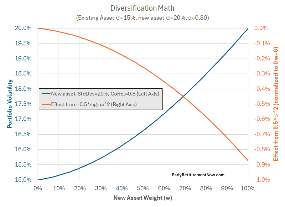 (As an aside: at zero vol, diversification and rebalancing will reduce portfolio return below the weighted average return — since the outperforming asset, which would have enjoyed a momentum-like contribution to overall portfolio return, is regularly rebalanced down.)